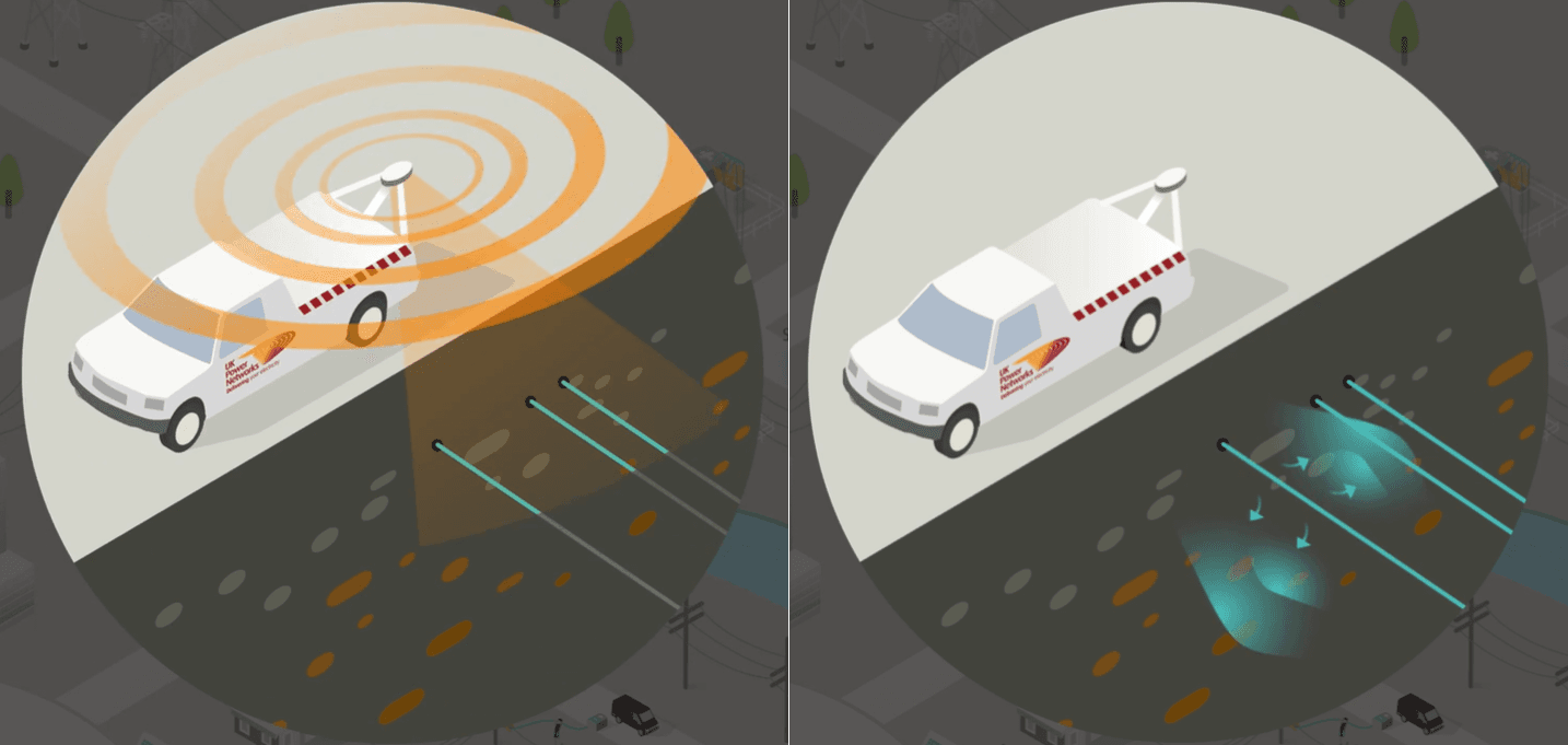 The loss associated with this earth fault leakage is called a Contact Voltage Loss, because the fault is detectable on the surface by detecting ‘contact voltage’. The Mobile Asset Assessment Vehicle (MAAV) detects these voltage changes and locates the precise area where we have to dig to find the defective cable.