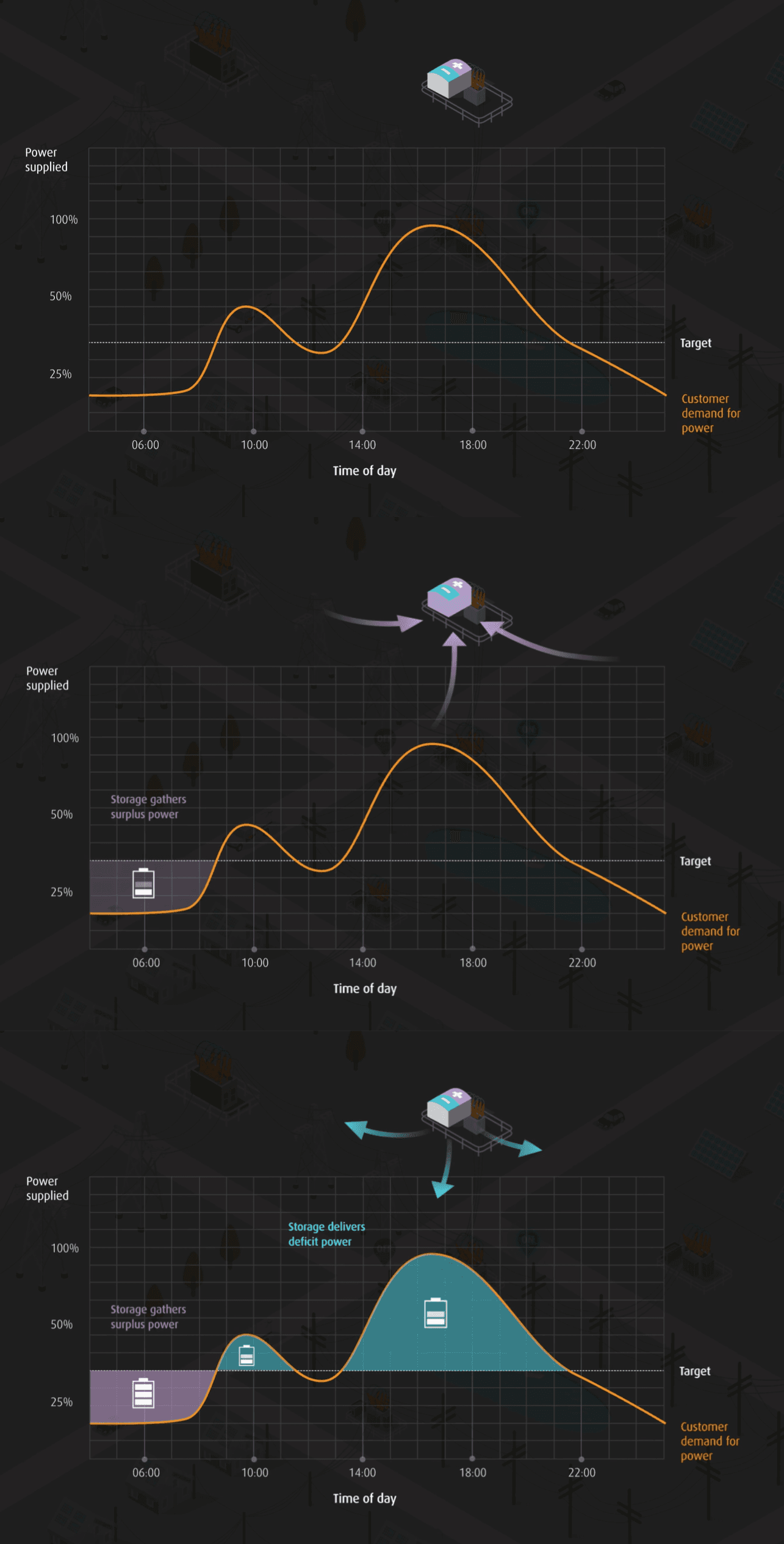 Battery storage is used on the distribution network to store electrical energy. It is generally charged at times of low demand, when energy is cheap, and discharged during peak demand when energy costs are higher.