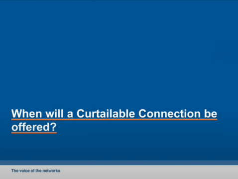 Curtailable Connections will typically be offered when the time to complete reinforcement is more than 12 months after completion of any extension assets / Customer Connection, and if the customer can be flexibly managed and comply with Flexible Connection requirement standard EDS 08 5060. Curtailable Connections are not offered to domestic and small commercial users. Curtailable Connections with and without an end date are available.
