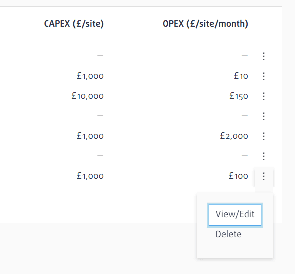 Selecting the asset type will display a list of the assets already creates, as well as an Add button to create new assets. Once you’ve created an asset, you can edit or delete it by clicking on the three dot menu to the right of the item (as shown on the right). Note that you will not be able to delete assets that are being used in a scenario. A maximum of five assets of each type can be created.