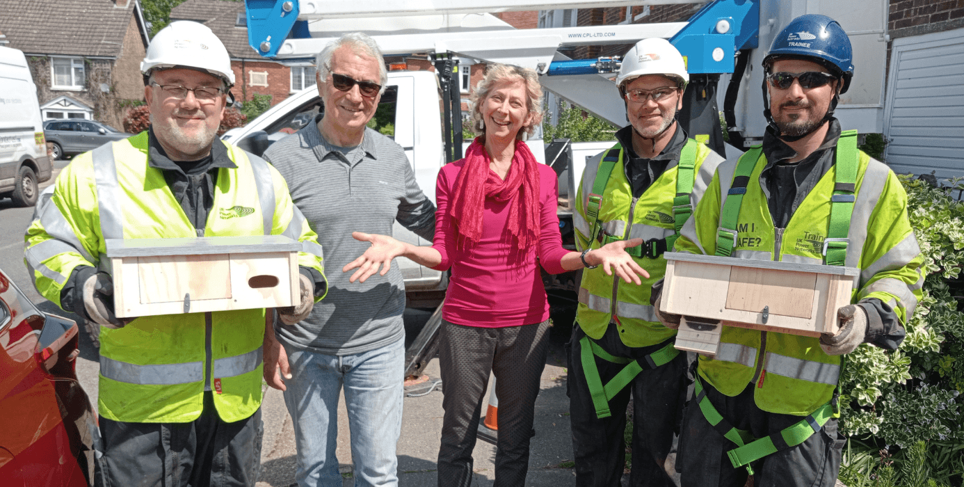 Ahead of World Swift Day on June 7, UK Power Networks linespeople teamed up with Trafalgar Neighbourhood Council, Horsham Men’s Shed and residents to fit seven swift nest boxes in hard-to-reach places on homes in the Trafalgar area.