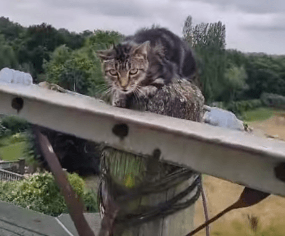 UK Power Networks’ team arrived on the scene to find the cat, who they named Lofty, precariously perched near live equipment. Despite attempts to coax it down, the frightened feline climbed even higher to ten metres. The situation grew more dangerous as the cat neared the 11,000-volt power lines, prompting the team to cut off the electricity supply to ensure a safe rescue.