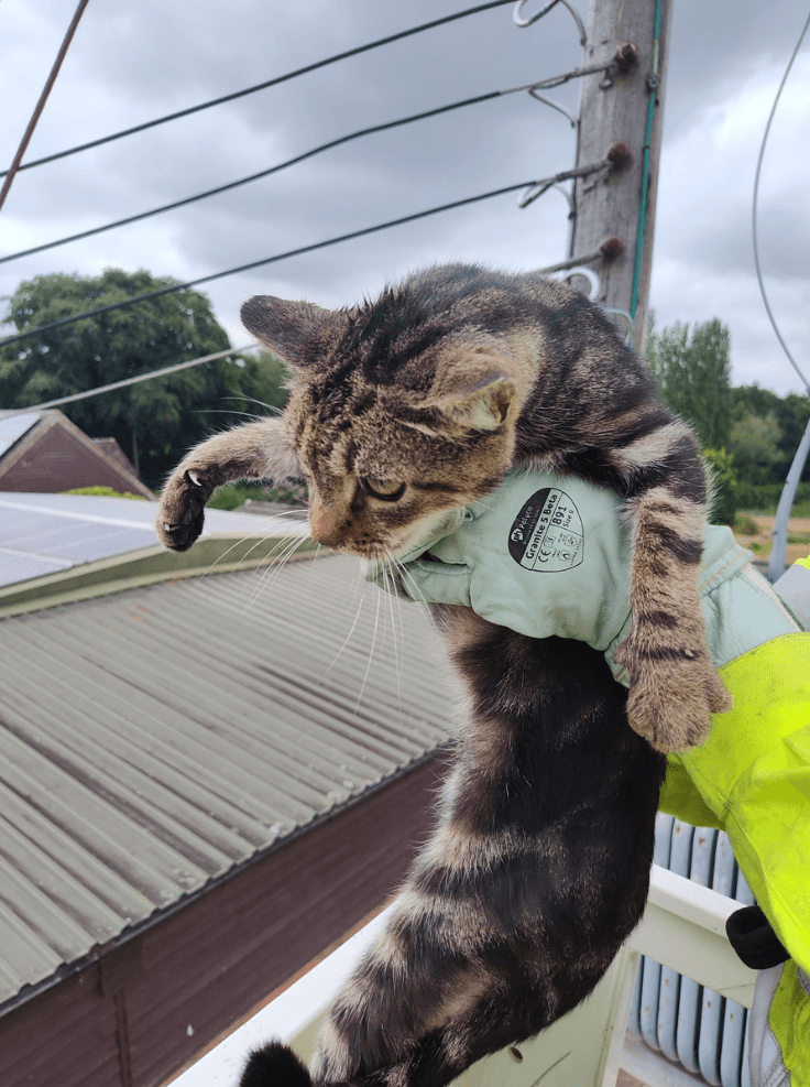 Robert Fitton, a first responder at UK Power Networks, explained: “I climbed up but couldn’t reach the cat. It held onto the pole, then ran further up like a bear and sat on the top. It wasn’t the friendliest cat, holding on to anything he could get his claws into. It was frightened but eventually I got it out from the back of the transformer onto the metalwork.”