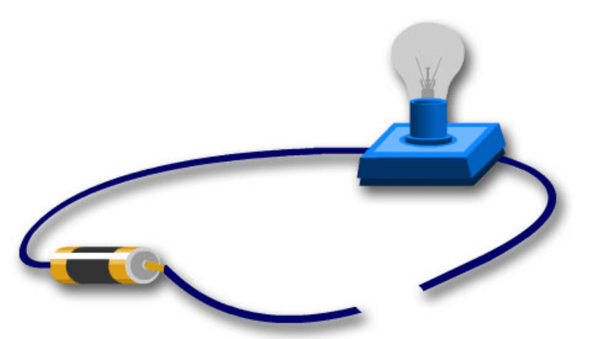 Electric current flows equally through all parts of the circuit. As the current flows through the bulb it lights up. The voltage produced by the battery pushes the current around the circuit.