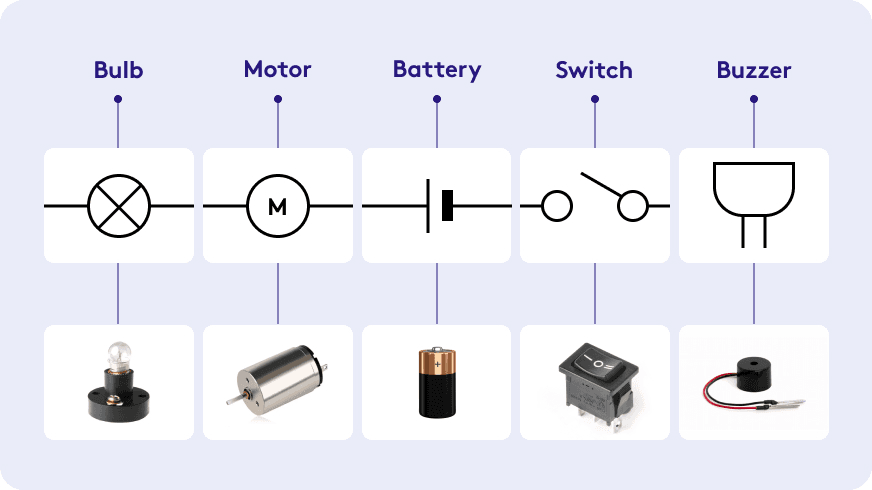 We don't draw circuit diagrams with colourful pictures of bulbs and buzzers.