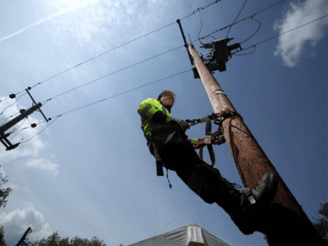 Working on a electricity pole with shared utilities such as telecom equipment